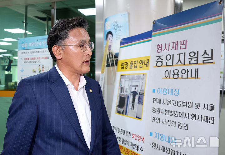 [서울=뉴시스] 이영환 기자 = 지역 개발사업을 명목으로 건축업자에게 금품을 받은 혐의로 구속영장이 청구된 박성만 경상북도의회 의장이 30일 오후 서울 서초구 서울중앙지방법원에서 열린 구속 전 피의자 심문(영장실짐심사)에 출석하고 있다. 2025.04.30. [email protected]