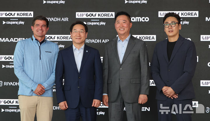 [인천=뉴시스] 전진환 기자 = 30일 인천 연수구 잭니클라우스CC에서 열린 LIV 골프 코리아 기자회견에서 유정복 인천시장 등 참석자들이 기념촬영을 하고 있다. 스콧 오닐 LIV 골프 CEO(왼쪽부터), 유정복 시장, 김희규 잭 니클라우스 골프클럽 코리아 총지배인, 이종록 쿠팡플레이 스포츠 총괄 전무. 2025.04.30. [email protected]