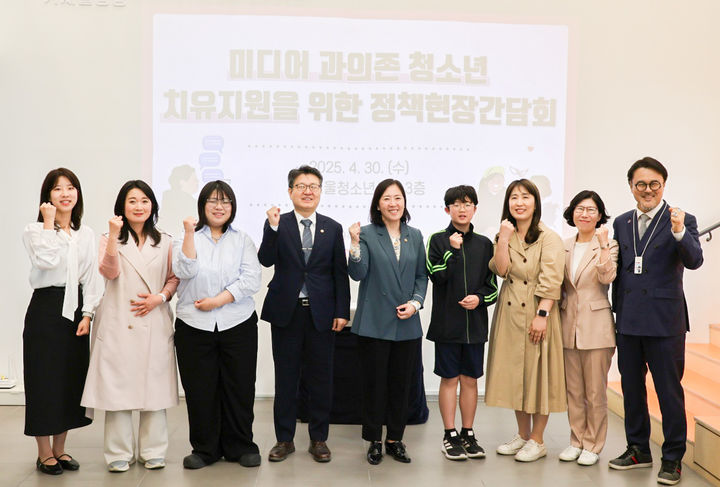 [서울=뉴시스] 황준선 기자 = 신영숙 여성가족부 차관(가운데)과 오석환 교육부 차관(왼쪽 네 번째)이 30일 오후 서울 서대문구 가재울청소년센터에서 열린 미디어 과의존 청소년 치유지원을 위한 정책현장 간담회에서 참석자들과 기념촬영을 하고 있다. (사진=여성가족부 제공) 2025.04.30. [email protected] *재판매 및 DB 금지