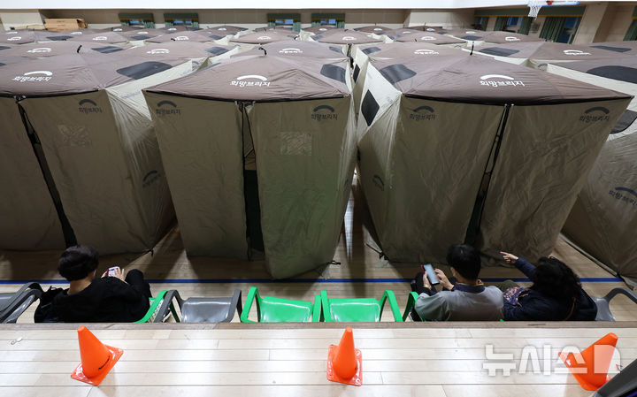 [대구=뉴시스] 이무열 기자 = 대구 북구 함지산 산불이 재발화한 30일 오후 대구 북구 동변중학교에 설치된 대피소에서 주민들이 휴식을 취하고 있다. 2025.04.30. [email protected]