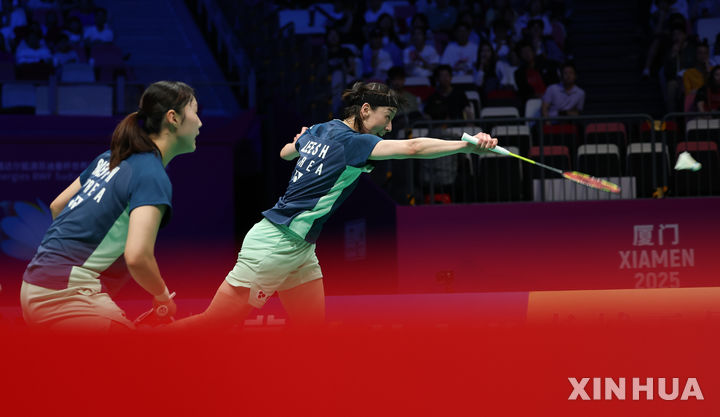 [샤먼=신화/뉴시스] 백하나(왼쪽)와 이소희가 지난달 30일(현지 시간) 중국 푸젠성 샤먼에서 열린 2025 세계배드민턴연맹(BWF) 수디르만컵 대만과의 조별 리그 B조 3차전 여자복식 4경기에서 셰이페이산-홍언쯔 조와 경기하고 있다. 백하나-이소희가 2-1(17-21 21-12 21-12)로 이기고 이미 8강 진출을 확정한 한국은 매치 스코어 4-1로 승리하며 3연승을 거뒀다. 2025.05.01.