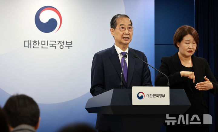 [서울=뉴시스] 고범준 기자 = 한덕수 대통령 권한대행 국무총리가 1일 서울 종로구 정부서울청사에서 대국민 담화를 하고 있다. 2025.05.01. [email protected]