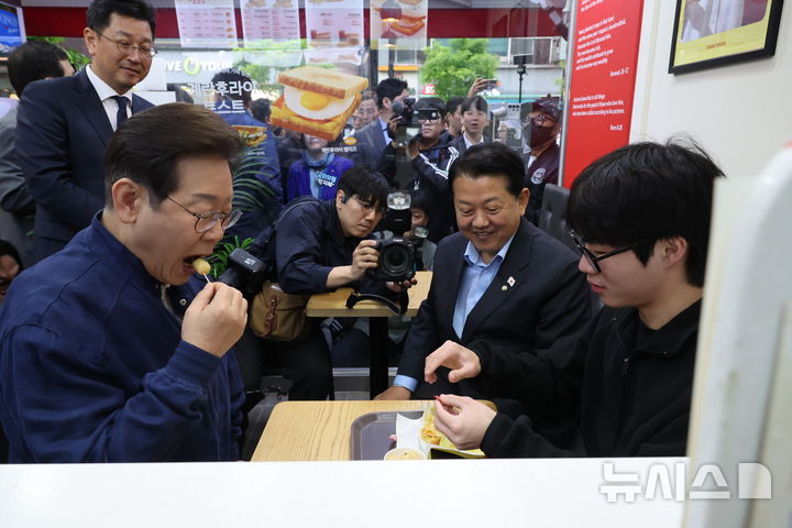 [포천=뉴시스] 조성우 기자 = 이재명 더불어민주당 대선후보가 1일 오후 경기 포천시 신읍사거리 인근서 골목골목 경청투어를 열고 음식을 맛보고 있다. 2025.05.01. [email protected]