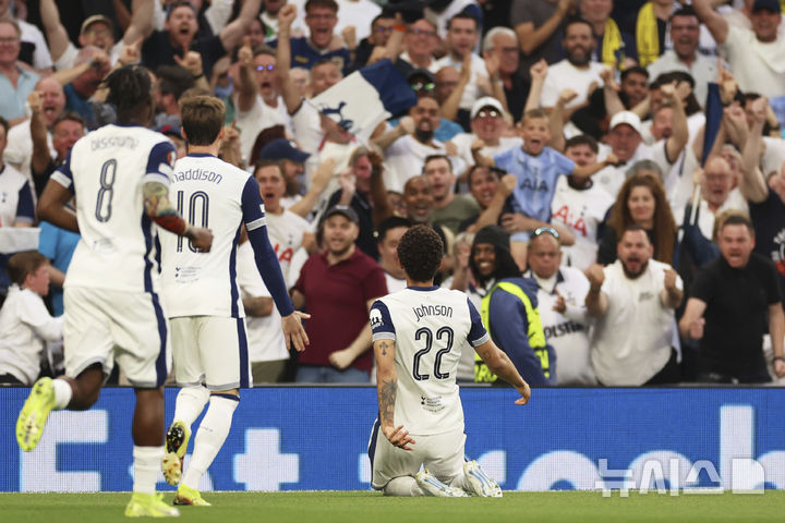 [런던=AP/뉴시스] 토트넘 홋스퍼의 브레넌 존슨(오른쪽)이 1일(현지 시간) 영국 런던 토트넘 홋스퍼 스타디움에서 열린 2024-25 유럽축구연맹(UEFA) 유로파리그(UEL) 준결승 1차전 보되/글림트(노르웨이)와의 경기 전반 1분 선제골을 넣은 후 세리머니하고 있다. 손흥민이 부상으로 결장한 토트넘은 3-1로 승리하며 결승 진출에 유리한 고지를 선점했다. 2025.05.02.
