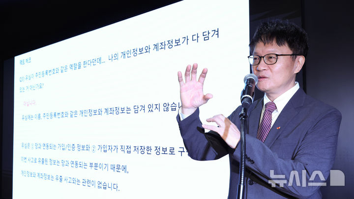 [서울=뉴시스] 조수정 기자 = 류정환 SK텔레콤 네트워크 인프라센터장이 2일 오전 서울 중구 SK텔레콤 T타워에서 유심 해킹 사이버 침해 관련 언론설명회에서 팩트 체크를 하고 있다. 2025.05.02. [email protected]