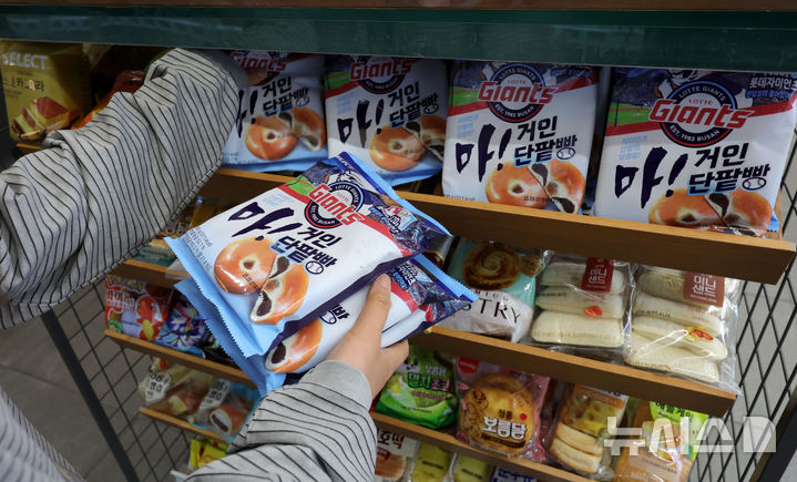 [서울=뉴시스] 홍효식 기자 = 롯데 계열 편의점 세븐일레븐이 롯데웰푸드와 손잡고 프로야구 롯데 자이언츠 팬을 위한 롯데빵을 출시한 2일 서울 시내 세븐일레븐 편의점에서 한 시민이 '마! 거인 단팥빵'을 몽땅 구입하고 있다. 2025.05.02. [email protected]
