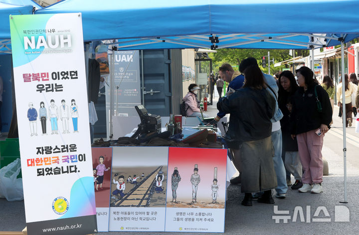 [서울=뉴시스] 김혜진 기자 = 2일 오후 서울 성동구 서울숲 언더스탠드에비뉴에서 열린 북한인권 체험형 전시프로그램 'ZOOM IN 2.0X'에서 시민들이 북한 물건을 살펴보고 있다. 2025.05.02. [email protected]