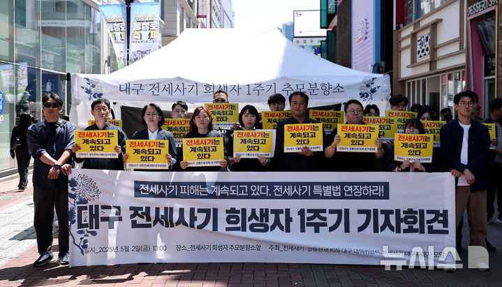 [대구=뉴시스] 이무열 기자 = 2일 대구 중구 동성로에서 전세사기·깡통전세 피해 대구 대책위원회, 전세사기 대구 피해자 모임 관계자들이 ‘대구 전세사기 희생자 1주기 기자회견’을 하고 있다. 2025.05.02. [email protected]