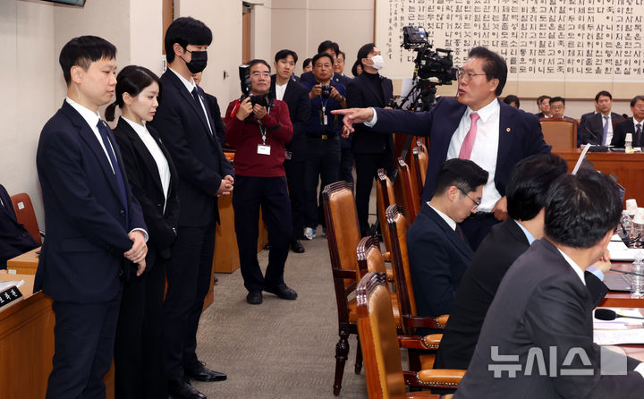 [서울=뉴시스] 조성봉 기자 = 송석준(오른쪽) 국민의힘 의원이 2일 오후 서울 여의도 국회에서 열린 법제사법위원회 전체회의에서 국회 경위들이 의원석 뒤에 서 있자 "왜 서 계신겁니까"라며 묻고 있다. 정청래 법사위원장은 곽규택 의원에게 퇴장 명령을 수차례 지시했으나 이를 거부하자 국회 경위들을 배치했다. 2025.05.02. [email protected]