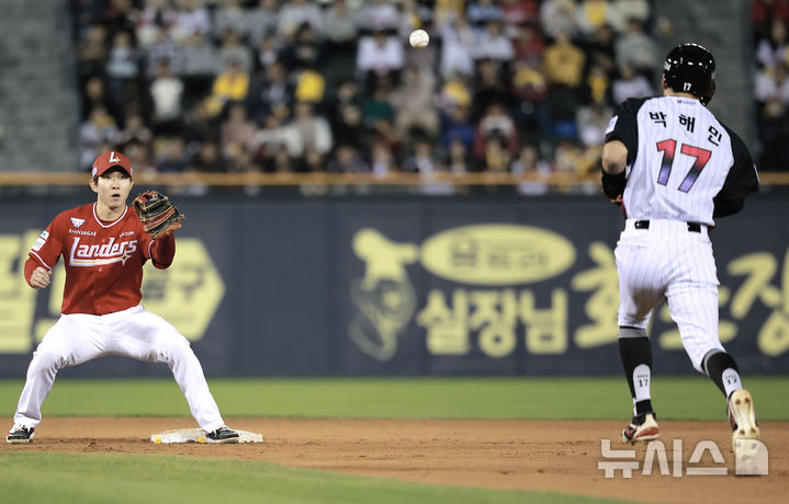 [서울=뉴시스] 정병혁 기자 = 2일 서울 송파구 잠실야구장에서 열린 2025 KBO리그 SSG 랜더스와 LG 트윈스의 경기, 7회말 무사 1루 상황 LG 신민재 타석 때 1루 주자 박해민이 2루 도루를 시도하다 아웃되고 있다.  2025.05.02. [email protected]