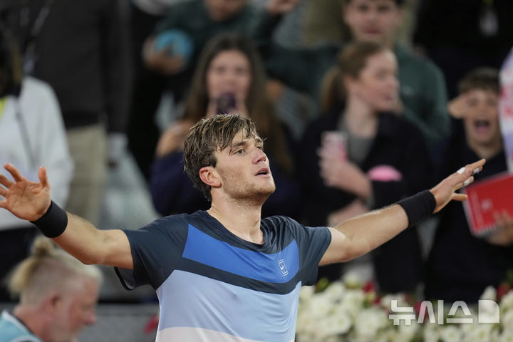 [마드리드=AP/뉴시스] 잭 드레이퍼(6위·영국)가 2일(현지 시간) 스페인 마드리드에서 열린 남자프로테니스(ATP) 마드리드오픈(ATP1000) 단식 준결승에서 로렌초 무세티(11위·이탈리아)를 꺾은 후 세리머니하고 있다. 드레이퍼가 2-0(6-3 7-6)으로 이기고 결승에 올라 카스페르 루드(15위·노르웨이)와 우승을 다툰다. 2025.05.02.