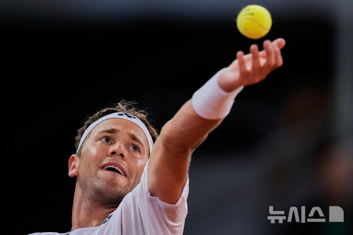 [마드리드=AP/뉴시스] 카스페르 루드(15위·노르웨이)가 2일(현지 시간) 스페인 마드리드에서 열린 남자프로테니스(ATP) 마드리드오픈(ATP1000) 단식 준결승에서 프란치스코 세룬돌로(21위·아르헨티나)와 경기하고 있다. 루드가 2-0(6-4 7-5)으로 이기고 결승에 올라 잭 드레이퍼(6위·영국)와 우승을 다툰다. 2025.05.02.