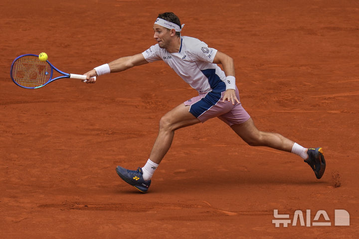[마드리드=AP/뉴시스] 카스페르 루드(15위·노르웨이)가 2일(현지 시간) 스페인 마드리드에서 열린 남자프로테니스(ATP) 마드리드오픈(ATP1000) 단식 준결승에서 프란치스코 세룬돌로(21위·아르헨티나)와 경기하고 있다. 루드가 2-0(6-4 7-5)으로 이기고 결승에 올라 잭 드레이퍼(6위·영국)와 우승을 다툰다. 2025.05.02.