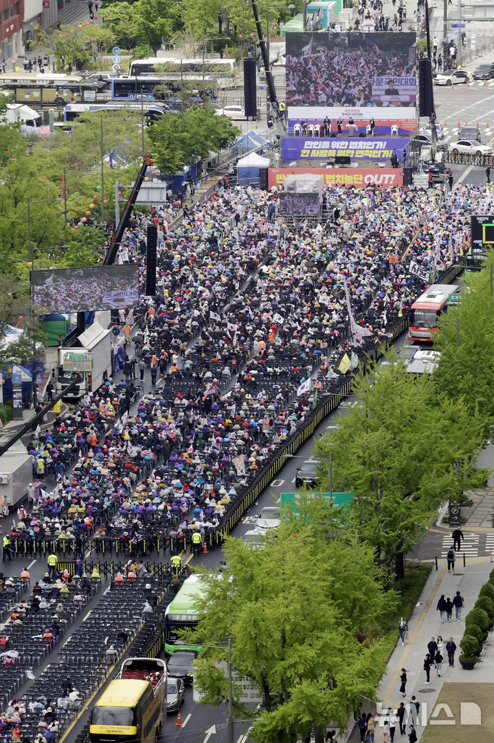 [서울=뉴시스] 최동준 기자 = 자유통일당이 3일 서울 광화문에서 '반국가세력법치농단OUT' 윤석열 전 대통령 탄핵 무효 촉구 집회를 열고 있다. 2025.05.03. [email protected]