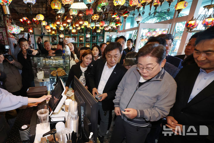 [강릉=뉴시스] 조성우 기자 = 민심을 청취하는 '경청 투어'에 나선 이재명 더불어민주당 대선후보가 3일 강원도 강릉시 안목해변 카페거리의 한 카페에서 음료를 고르고 있다. 2025.05.03. [email protected]