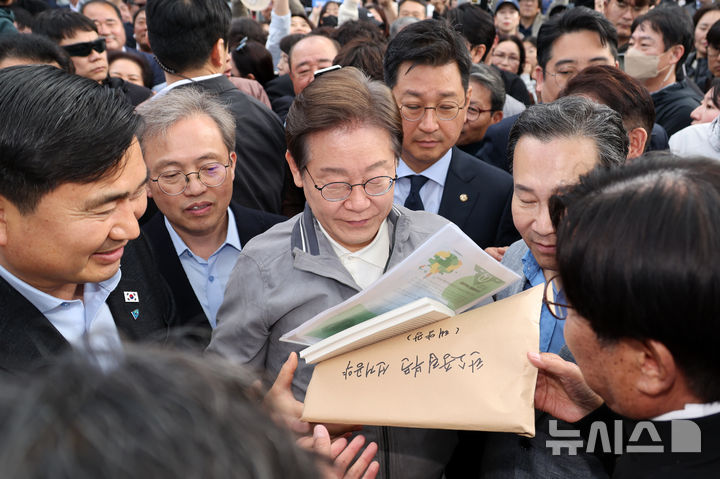 [삼척=뉴시스] 조성우 기자 = 민심을 청취하는 '경청 투어'에 나선 이재명 더불어민주당 대선후보가 3일 강원도 삼척시 삼척해수욕장 인근에서 환경시민단체 관계자로부터 대선 공약 요구 자료를 받고 있다. 2025.05.03. [email protected]