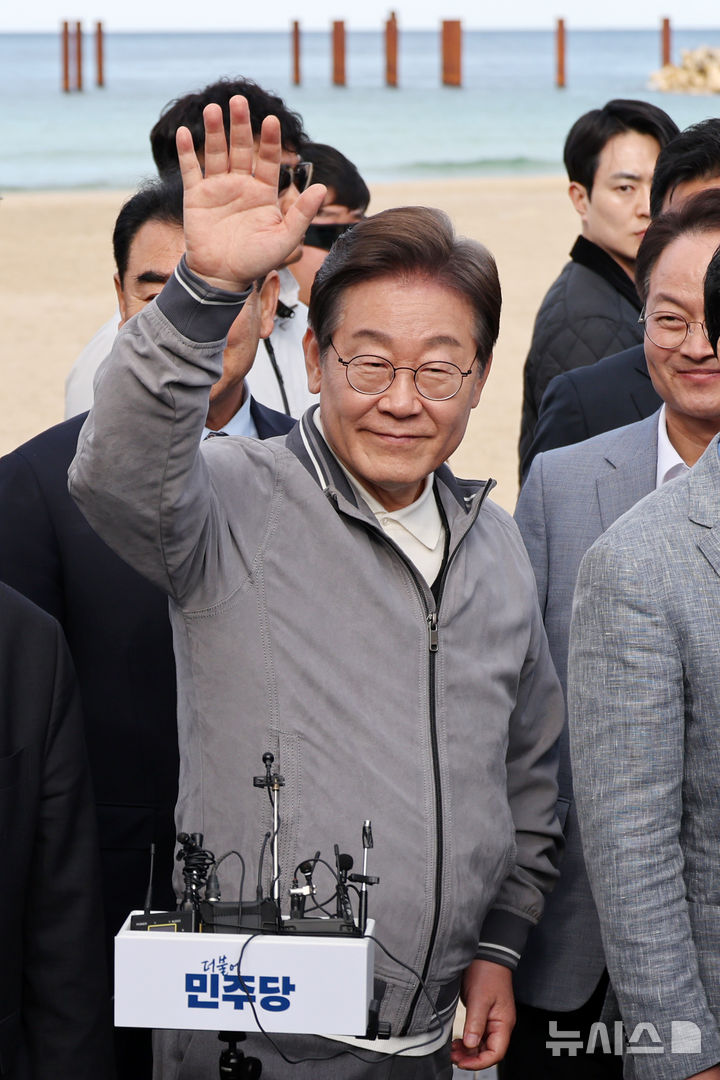 [삼척=뉴시스] 조성우 기자 = 민심을 청취하는 '경청 투어'에 나선 이재명 더불어민주당 대선후보가 3일 강원도 삼척시 삼척해수욕장 인근에서 주민과 관광객들을 만난 뒤 백브리핑을 마치고 이동하고 있다. 2025.05.03. [email protected]