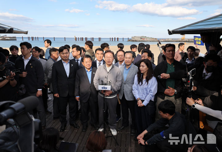 [삼척=뉴시스] 조성우 기자 = 민심을 청취하는 '경청 투어'에 나선 이재명 더불어민주당 대선후보가 3일 강원도 삼척시 삼척해수욕장 인근에서 주민과 관광객들을 만난 뒤 백브리핑을 하고 있다. 2025.05.03. [email protected]