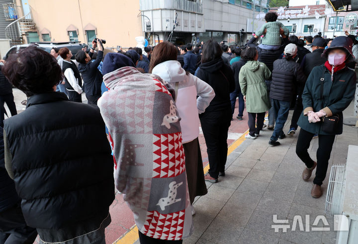 [태백=뉴시스] 조성우 기자 = 3일 강원도 태백시 장성중앙시장에서 한 주민이 민심을 청취하는 '경청 투어'에 나선 이재명 더불어민주당 대선후보를 보기 위해 담요를 두르고 기다리고 있다. 2025.05.03. [email protected]