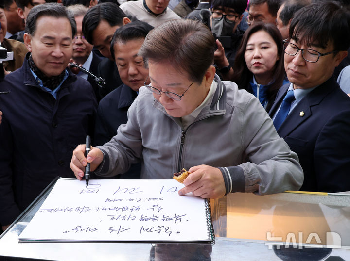 [태백=뉴시스] 조성우 기자 = 민심을 청취하는 '경청 투어'에 나선 이재명 더불어민주당 대선후보가 3일 강원도 태백시 장성중앙시장에서 잉어빵을 파는 상인에게 방명록을 남기고 있다. 2025.05.03. [email protected]