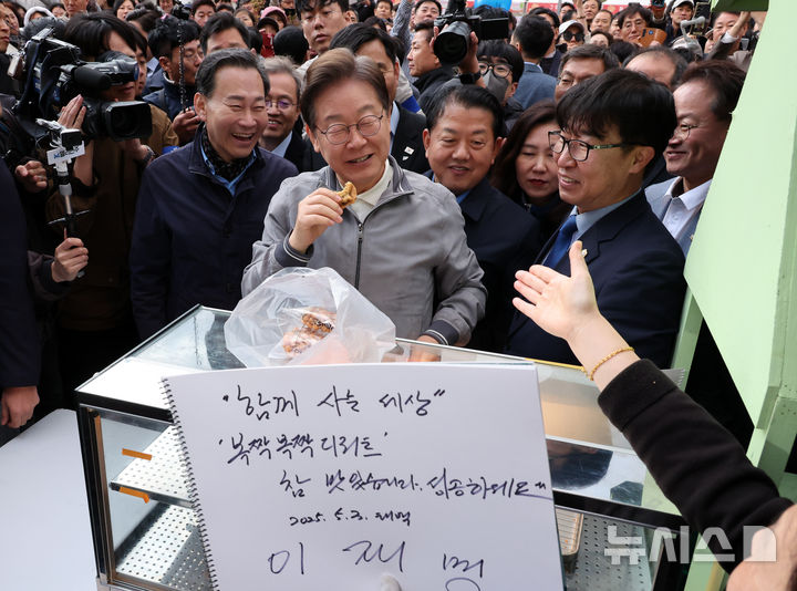 [태백=뉴시스] 조성우 기자 = 민심을 청취하는 '경청 투어'에 나선 이재명 더불어민주당 대선후보가 3일 강원도 태백시 장성중앙시장에서 잉어빵을 파는 상인에게 방명록을 남기고 인사하고 있다. 2025.05.03. [email protected]