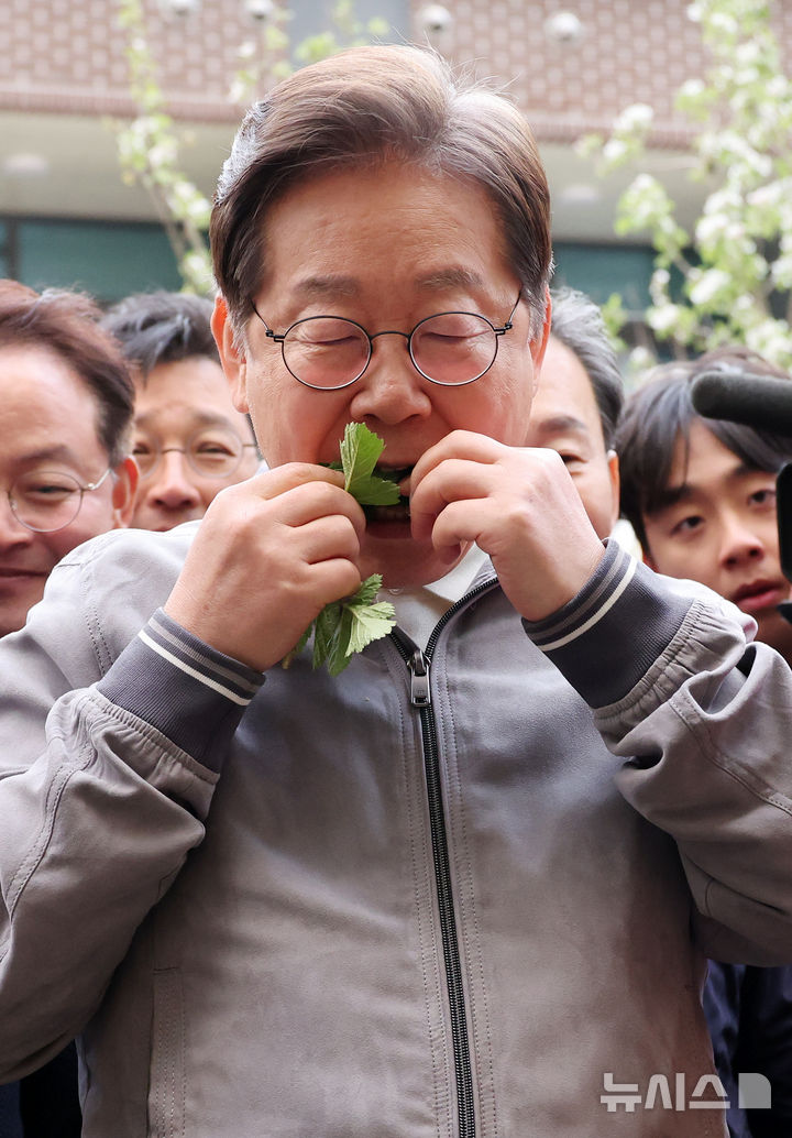 [태백=뉴시스] 조성우 기자 = 민심을 청취하는 '경청 투어'에 나선 이재명 더불어민주당 대선후보가 3일 강원도 태백시 장성중앙시장에서 어수리 나물을 맛보고 있다. 2025.05.03. [email protected]