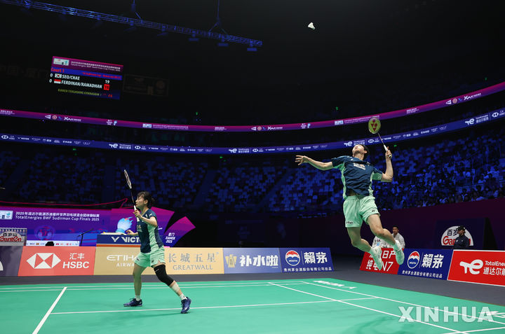 [샤먼=신화/뉴시스] 서승재-채유정이 3일(현지 시간) 중국 푸젠성 샤먼에서 열린 2025 세계배드민턴연맹(BWF) 수디르만컵 인도네시아와의 준결승 혼합 복식 1경기에서 데얀 페르디난시아-시티 파디아 실바 라마단티 조와 경기하고 있다. 서승재-채유정이 2-0(21-10 21-15)으로 이긴 한국이 매치 스코어 3-2로 승리하며 결승에 올라 일본을 3-0으로 완파한 중국과 패권을 다툰다. 2025.05.04.