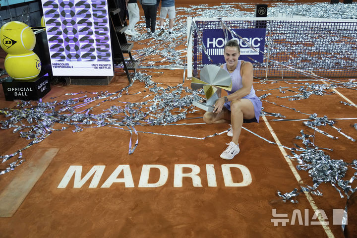 [마드리드=AP/뉴시스] 아리나 사발렌카(1위·벨라루스)가 3일(현지 시간) 스페인 마드리드에서 열린 여자프로테니스(WTA) 마드리드오픈(WTA1000) 단식 정상에 올라 트로피를 들고 포즈를 취하고 있다. 사발렌카는 결승에서 코코 고프(4위·미국)를 2-0(6-3 7-6)으로 완파하고 이 대회 3번째 우승을 차지했다. 2025.05.04.