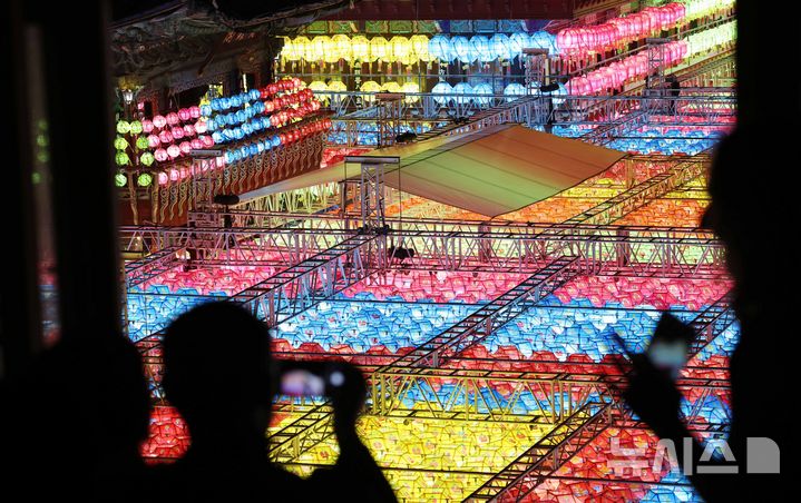 [부산=뉴시스] 하경민 기자 = 불기 2569년 부처님 오신 날을 앞둔 3일 밤 부산 부산진구 삼광사를 찾은 관광객들이 환하게 불을 밝힌 7만개의 연등을 휴대전화로 촬영하고 있다. 2025.05.04. [email protected]