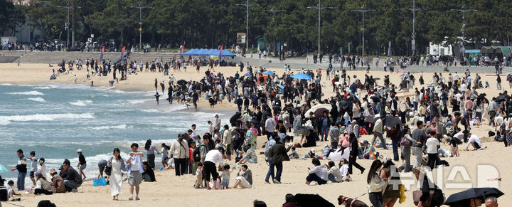[부산=뉴시스] 하경민 기자 = 황금연휴 기간인 4일 부산 해운대구 해운대해수욕장을 찾은 시민과 관광객들이 나들이를 즐기고 있다. 2025.05.04. [email protected]