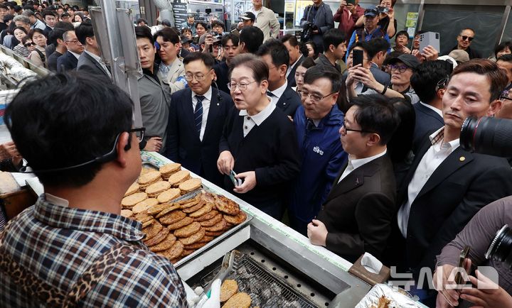 [단양=뉴시스] 조성봉 기자 = 민심을 청취하는 '경청 투어'에 나선 이재명 더불어민주당 대선후보가 4일 충북 단양구경시장에서 시장 상인 대화를 하고 있다.2025.05.04. [email protected]