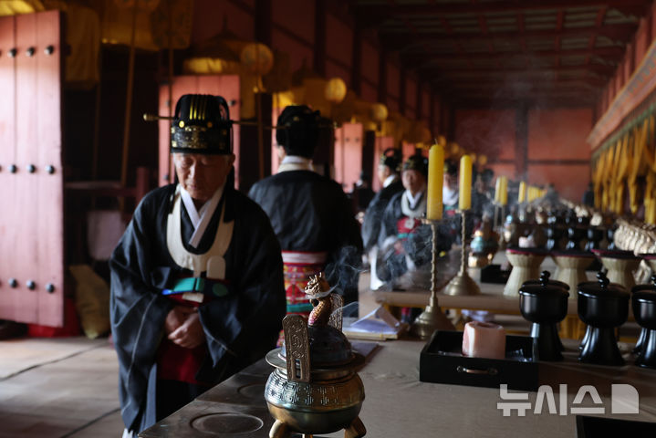 [서울=뉴시스] 이영환 기자 = 4일 오후 서울 종로구 종묘에서 봉행된 '종묘대제'에서 취위가 진행되고 있다. 취위는 제향을 시작하기 전 제관들이 정해진 자리에 서는 절차이다. (공동취재) 2025.05.04. [email protected]