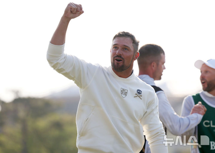 [인천=뉴시스] 홍효식 기자 = 브라이슨 디섐보가 4일 인천 연수구 송도 잭 니클라우스 골프클럽 코리아에서 열린 LIV 골프 코리아 최종 라운드 18번홀에서 챔피언이 결정되자 기뻐하고 있다. 2025.05.04. [email protected]