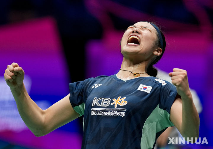 [샤먼=신화/뉴시스] 안세영이 4일(현지 시간) 중국 푸젠성 샤먼에서 열린 2025 세계배드민턴연맹(BWF) 수디르만컵 중국과의 결승전 여자 단식 2경기에서 왕즈이를 꺾은 후 포효하고 있다. 안세영이 2-0(21-17 21-16)으로 승리했으나 한국은 혼합 복식, 남자 단식, 여자 복식에서 모두 패해 매치 스코어 1-3으로 준우승을 거뒀다. 2025.05.05.