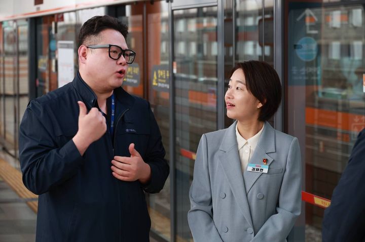 [서울=뉴시스] =김재연 진보당 대선 후보가 5일 서울 옥수역에서 '구의역 김군' 동료노동자들을 만나 대화를 나누고 있다. (사진=진보당 제공) 2025.05.05. [email protected] *재판매 및 DB 금지