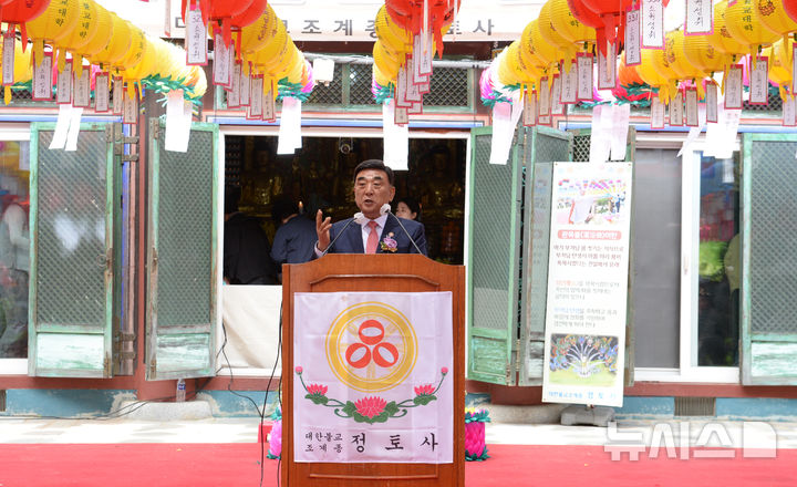 [울산=뉴시스] 배병수 기자 = 김두겸 울산시장이 5일 남구 정토사(회주 산화 덕진스님)에서 열린 불기 2569년 부처님오신날 법요식에서 축사를 하고 있다. [email protected].
