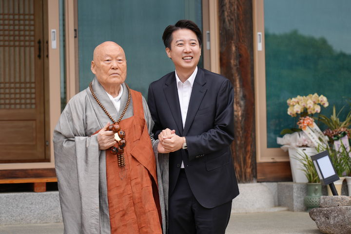 [서울=뉴시스] 권창회 기자 = 이준석 개혁신당 대선 후보가 5일 대구 동화사에서 의현스님과 차담을 하고 있다. (사진=이준석 캠프 제공) 2025.05.05. [email protected] *재판매 및 DB 금지