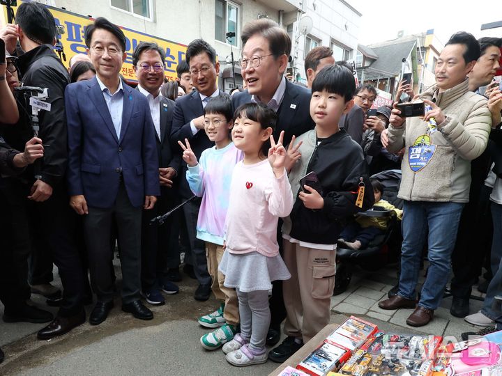 [양평=뉴시스] 조성봉 기자 = 민심을 청취하는 '경청 투어'에 나선 이재명 더불어민주당 대선후보가 5일 경기 양평군 양평시장 장난감 가게 앞에서 어린이들과 기념촬영을 하고 있다. 2025.05.05. [email protected]