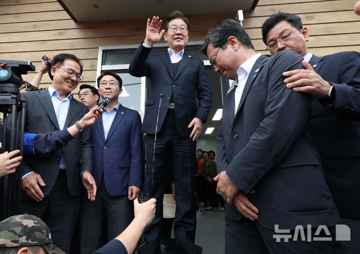 [여주=뉴시스] 조성봉 기자 = 민심을 청취하는 '경청 투어'에 나선 이재명 더불어민주당 대선후보가 5일 경기 여주시 구양리 새마을식당에서 신발을 벗고 의자 위에 올라가 즉흥 연설을 하고 있다.2025.05.05. [email protected]