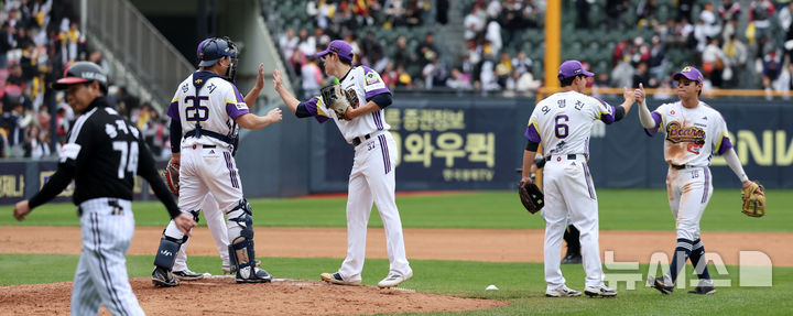 [서울=뉴시스] 김선웅 기자 = 어린이날인 5일 서울 송파구 잠실야구장에서 열린 2025 프로야구 LG 트윈스 vs 두산 베어스의 경기, 5-2로 LG에 승리를 거둔 두산 선수들이 자축하고 있다. 2025.05.05. [email protected]