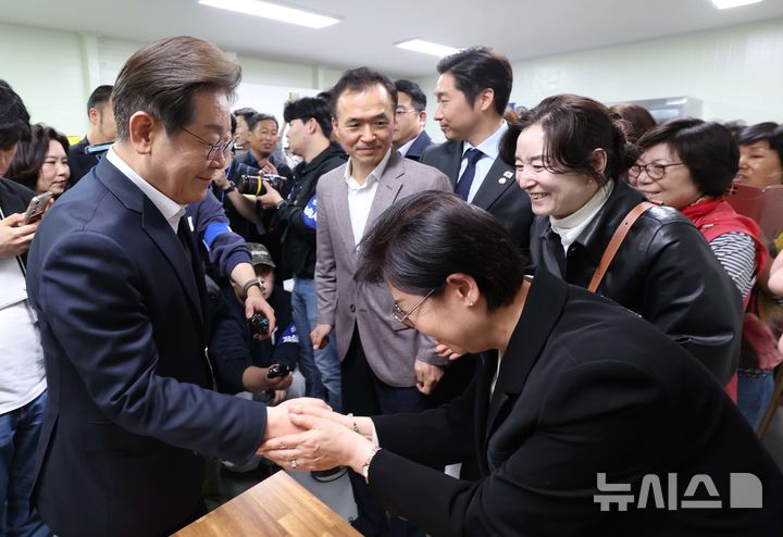 [여주=뉴시스] 조성봉 기자 = 민심을 청취하는 '경청 투어'에 나선 이재명 더불어민주당 대선후보가 5일 경기 여주시 구양리 새마을식당에서 주민들과 인사를 하고 있다.2025.05.05. [email protected]