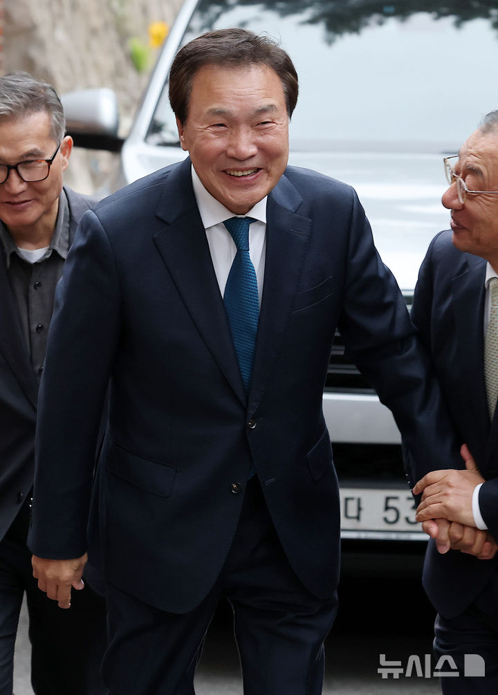 [서울=뉴시스] 조수정 기자 = 손학규 전 민주당 대표가 5일 한덕수 무소속 대통령 선거 예비 후보와 만찬 회동을 갖기위해 서울 종로구 한 식당으로 들어서며 이정현 한덕수 캠프 대변인과 인사를 나누고 있다. (공동취재) 2025.05.05. [email protected]