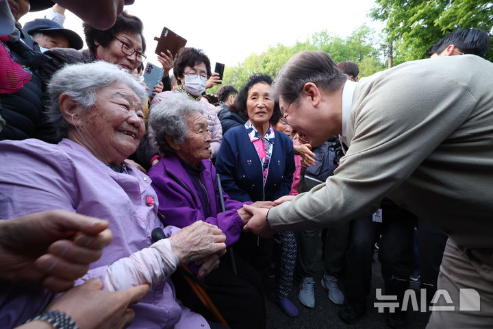 [장수=뉴시스] 조성봉 기자 = 민심을 청취하는 '경청 투어'에 나선 이재명 더불어민주당 대선후보가 6일 전북 장수군 천천면 오옥마을에서 어르신들과 인사를 나누고 있다.2025.05.06. [email protected]