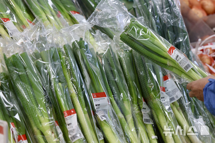 [서울=뉴시스] 김명년 기자 = 6일 한국농촌경제연구원은 '농업관측 5월호' 보고서를 통해 이달 배추(상품) 도매가격이 10㎏에 7000원으로 1년 전보다 31.5% 내릴 것으로 전망했다. 이는 저장 배추 재고와 봄배추 생산이 증가할 것으로 예측되는 데 따른 것이다. 대파는 1㎏에 1100원으로 1년 전보다 41.9% 하락하고 평년보다 36.9% 저렴해질 것으로 예측했다. 이날 오전 서울시내 한 대형마트에 대파가 진열돼 있다. 2025.05.06. [email protected]