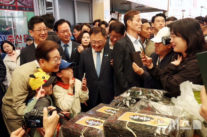 [증평=뉴시스] 조성봉 기자 = 민심을 청취하는 '경청 투어'에 나선 이재명 더불어민주당 대선후보가 6일 충북 증평군 장뜰시장에서 어린이들과 기념촬영을 하고 있다. 2025.05.06. [email protected]