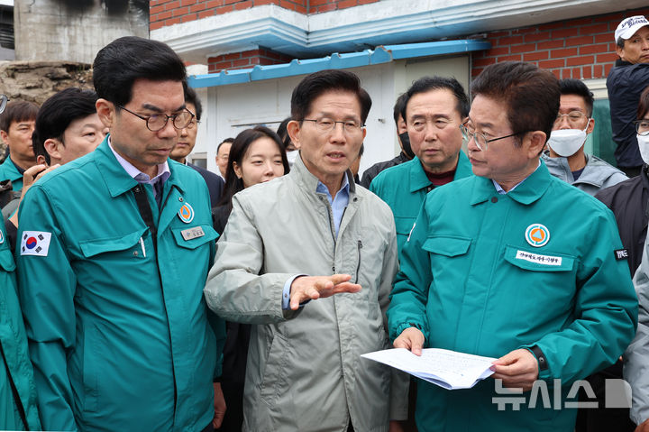 [영덕=뉴시스] 권창회 기자 = 김문수 국민의힘 대선 후보가 6일 산불피해가 있었던 경북 영덕군 석리따개비마을을 방문해 이철우 경북도지사로부터 산불피해상황을 보고받고 있다. 2025.05.06. [email protected]