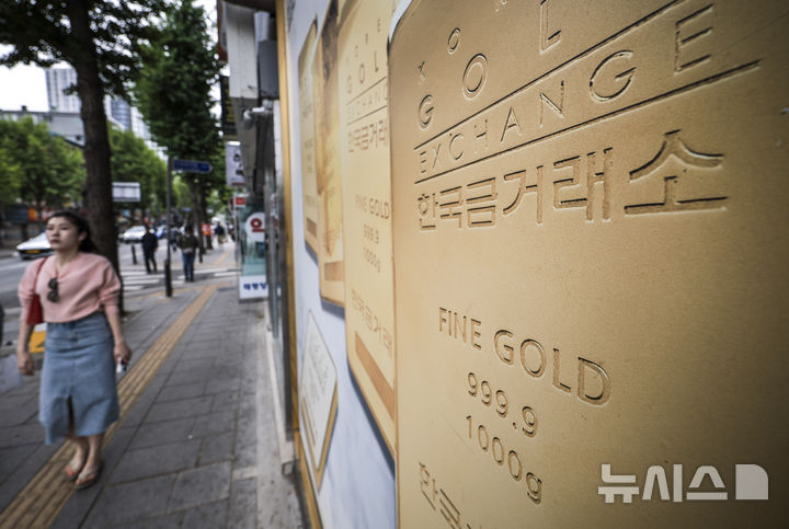 [서울=뉴시스] 정병혁 기자 = 6일 서울시내에서 시민들이 금은방 앞을 지나고 있다. 금값이 고공행진을 이어가면서 은행권 골드뱅킹 잔액이 사상 처음으로 1조1000억원을 넘어섰다. KB국민·신한·우리은행의 지난달 말 기준 골드뱅킹 잔액은 1조1025억원으로 집계됐다. 지난 3월 말(1조265억원)과 비교해, 한 달 새 760억원 늘었으며, 1년 전인 지난해 4월 말(6천101억원)의 1.8배 수준이다. 2025.05.06. [email protected]