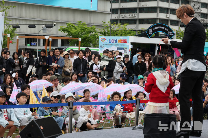 [서울=뉴시스] 김명원 기자 = 6일 서울 종로구 광화문 광장에서 열린 '2025 광화문 가족 동행 축제-펀(FUN)펀(FUN)한 광화문광장' 행사에 참여한 어린이들과 시민들이 마술쇼를 관람하고 있다. 2025.05.06. [email protected]