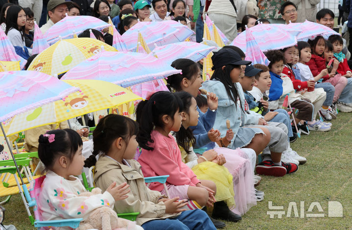 [서울=뉴시스] 김명원 기자 = 6일 서울 종로구 광화문 광장에서 열린 '2025 광화문 가족 동행 축제-펀(FUN)펀(FUN)한 광화문광장' 행사에 참여한 어린이들이 마술쇼를 관람하고 있다. 2025.05.06. [email protected]