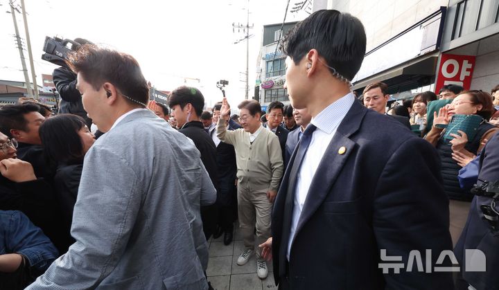 [금산=뉴시스] 조성봉 기자 = 민심을 청취하는 '경청 투어'에 나선 이재명 더불어민주당 대선후보가 6일 충남 금산군 시외고속터미널 인근에서 시민들에게 인사를 하고 있는 가운데 경찰이 경호를 하고 있다.2025.05.06. [email protected]